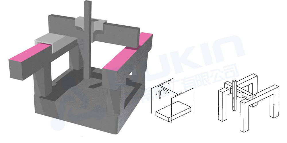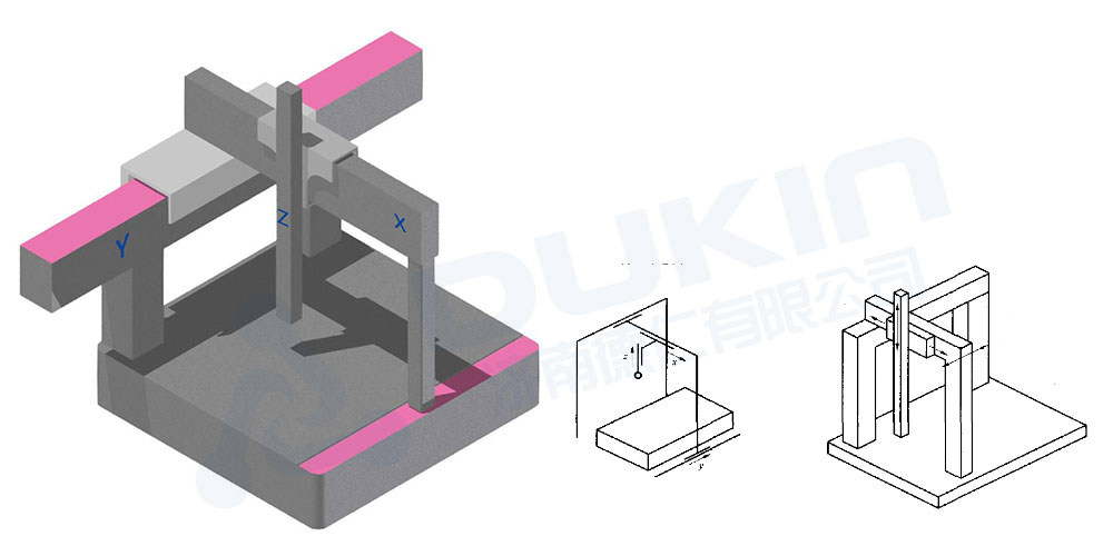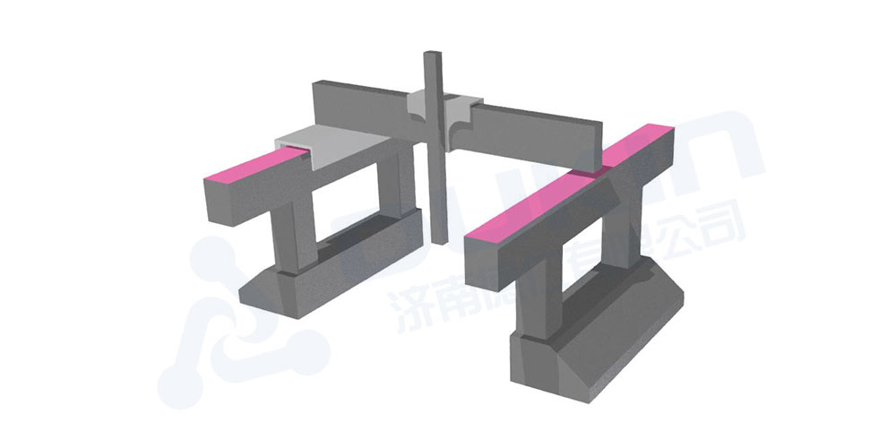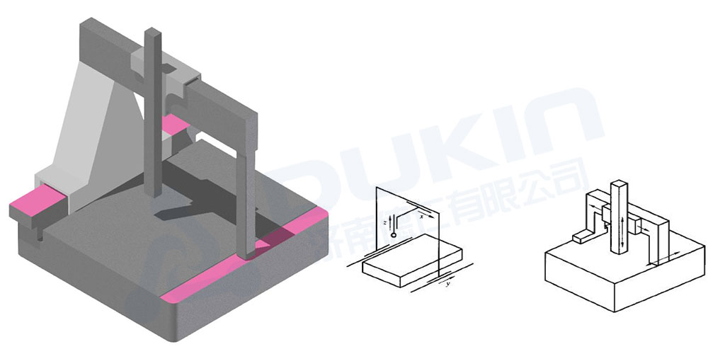 缺點(diǎn):X軸(橫梁部分)不能太重,否則會(huì)造成Y向移動(dòng)時(shí),移動(dòng)重心與導(dǎo)軌面(粉色面)距離太大。在測(cè)量的瞬間,由于慣性會(huì)給粉色導(dǎo)軌面上的空氣軸承造成較大的力矩,可能會(huì)使氣墊發(fā)生變化(空氣墊一般為3~8um),因此造成測(cè)量偏差。